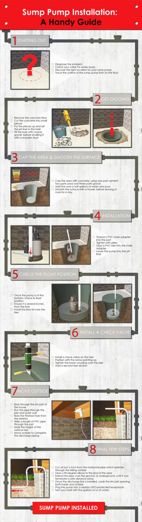 To help visualise how you can install a sump pump we have painstakingly produced this infographic to document the process step by step, enjoy.